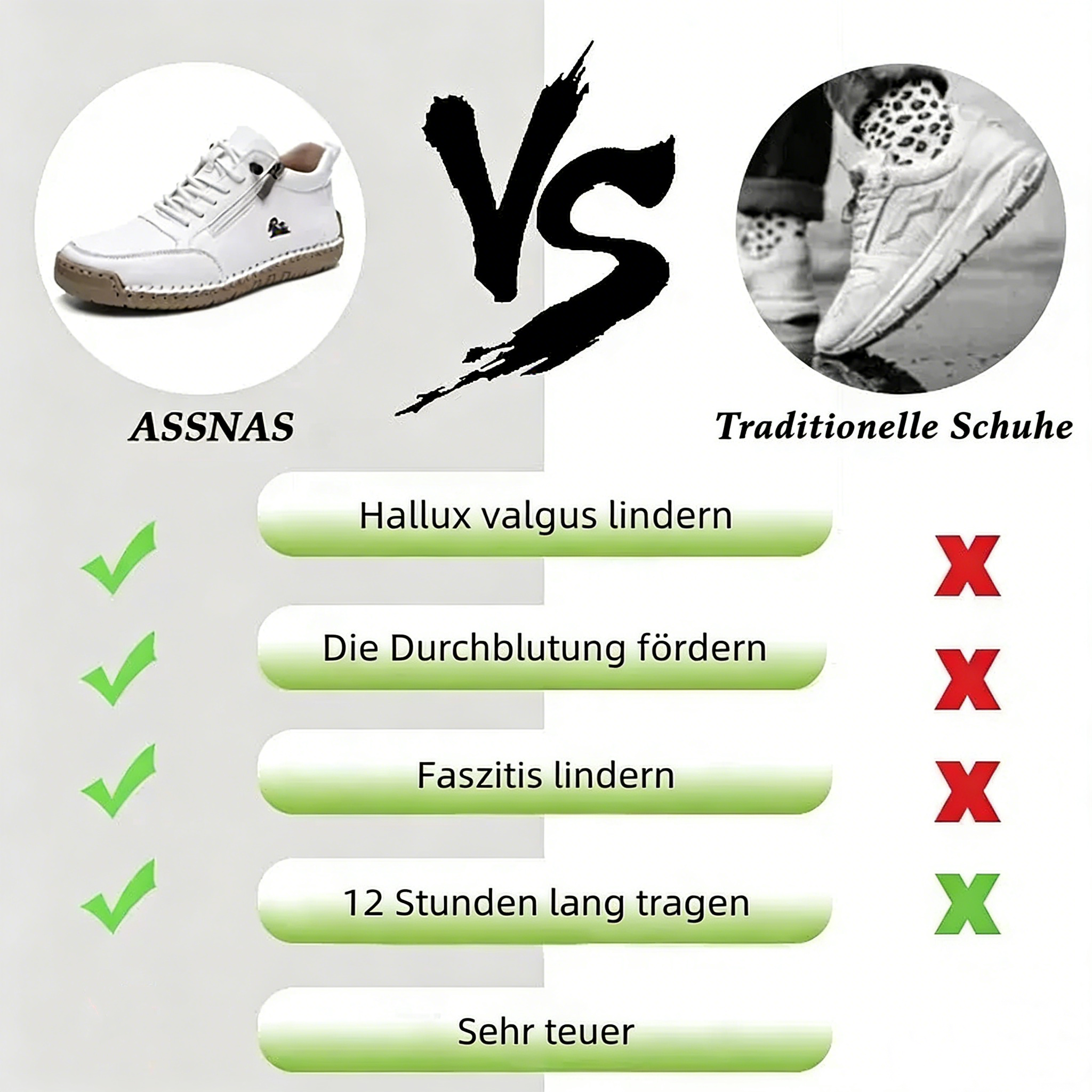 ASSNAS bietet ergonomische, bequeme und schmerzlindernde Schuhe für ein völlig neues Tragegefühl. Im Gegensatz zu herkömmlichen Schuhen, die die Zehenbewegung einschränken, bietet unser Design Ihren Zehen uneingeschränkte Bewegungsfreiheit. Verabschieden Sie sich von Verspannungen und Schmerzen in den Beinen und genießen Sie uneingeschränkte Bewegungsfreiheit. Dank der integrierten Fußgewölbeunterstützung bieten unsere Schuhe gleichmäßige Unterstützung, verbessern die Körperhaltung und das Gleichgewicht. Das Tragen von Schuhen mit Fußgewölbeunterstützung kann Schmerzen in Füßen, Beinen und im unteren Rücken lindern und Ihnen so mehr Leistungsfähigkeit und Konzentration bei Ihren täglichen Aufgaben ermöglichen.